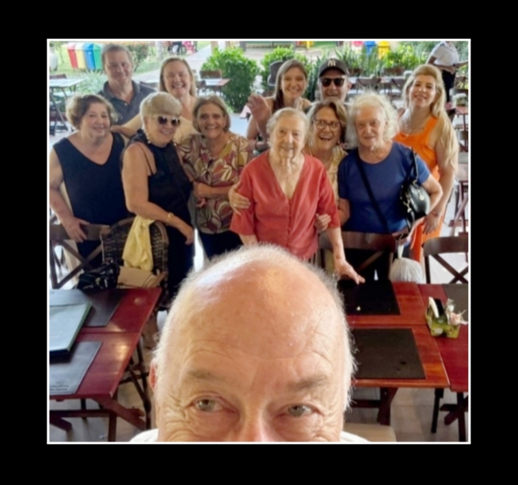 Na foto, da esquerda para a direita acima, estão: Marcelo, eu, Lívia, Ricardo, Fernanda, minha tia Tereza de 89 anos e minha amada mãe Helena de 86. Abaixo, minhas queridas primas Heloísa, Marta, Marili e Marília. E na selfie, o meu primo Arnaldo!